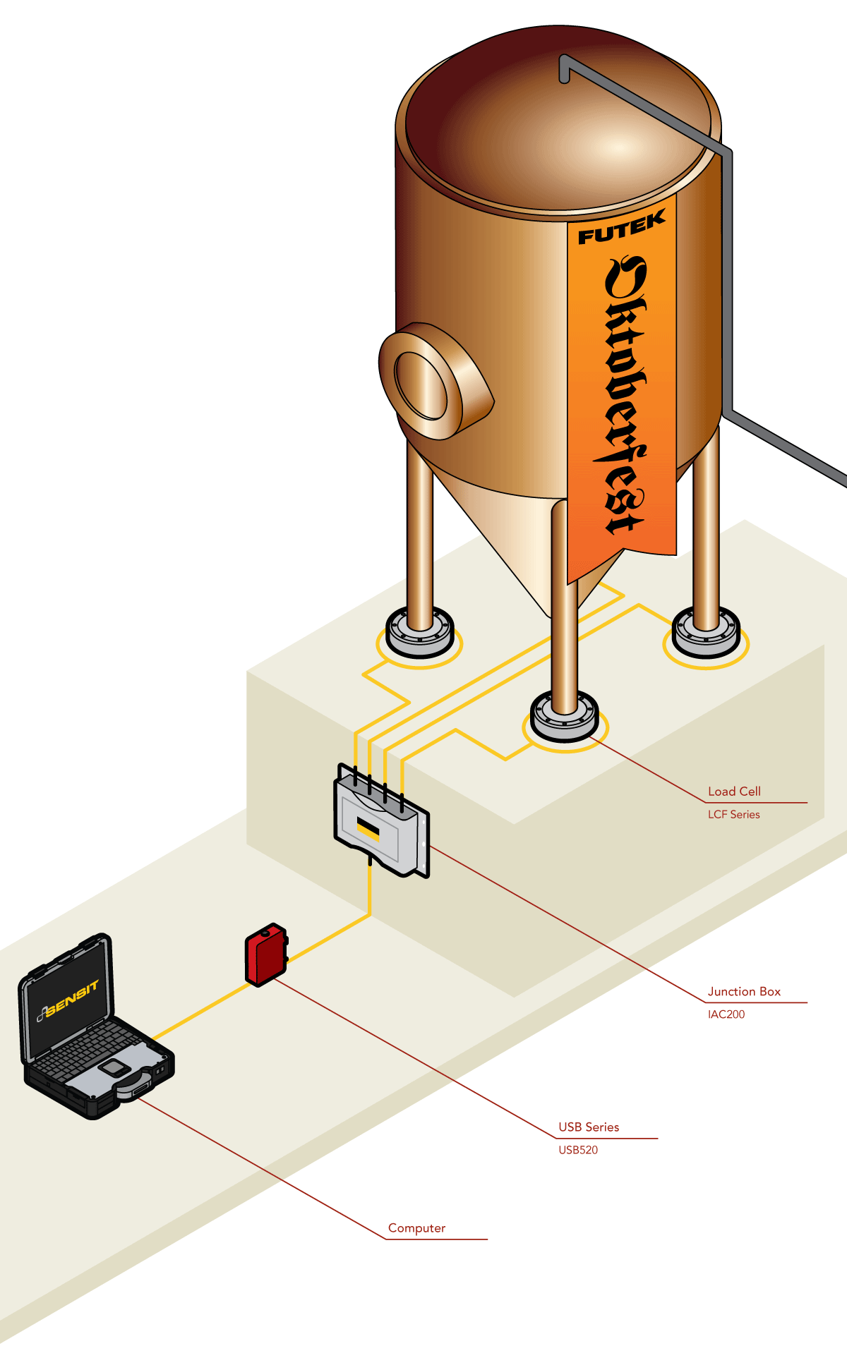 四個薄餅式測力傳感器(LCF系列),搭配儀表(IAC200和USB520)。