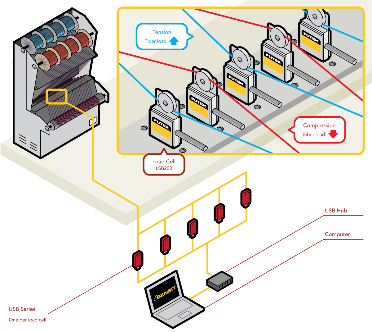 3、為了更有效更方便地測量纖維的拉壓力,我們在LSB200上安裝了滑輪配件。傳感器尺寸小,非常容易整合到機器中去。(傳感器尺寸平扁,我們可以將LSB200并排安裝使用。)