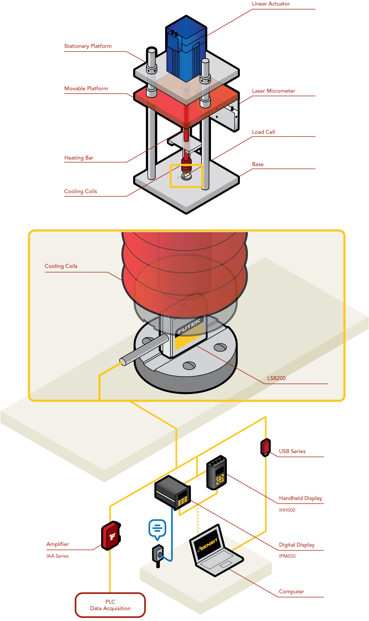 2、FUTEK LSB200微型S型傳感器安裝在測力臺架的底部,正對著加熱棒和冷卻盤管下方。LSB200傳感器特殊的設計,使得傳感器在臺架加熱和冷卻降溫的過程中,測試結果不受影響。