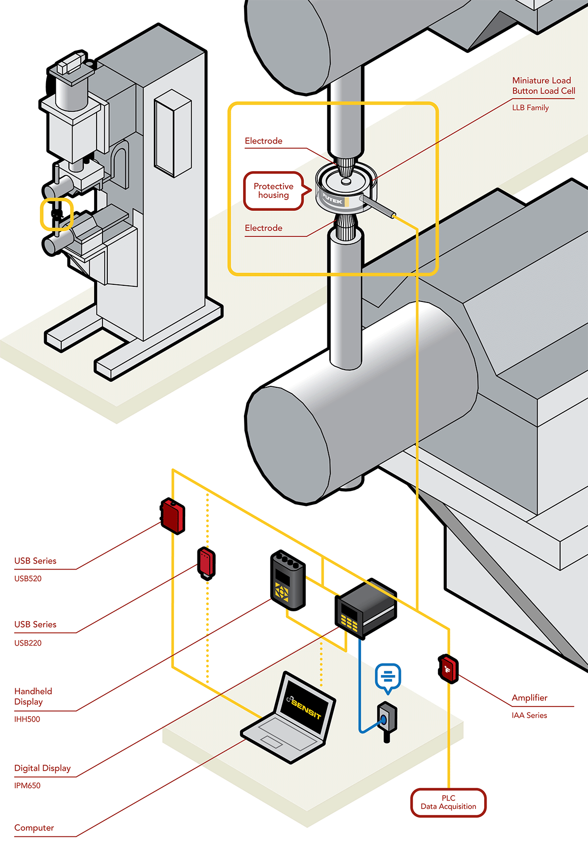 4、在這個應用中,FUTEK 的 LLB300 微型按鈕力傳感器被放置在電極之間以校準施加的力。當機器施加壓力時,LLB300將感知負載測量,并可以通過 USB 采集方案在 IHH500 手持顯示器、IPM650 面板安裝顯示器或 PC 上顯示數值。