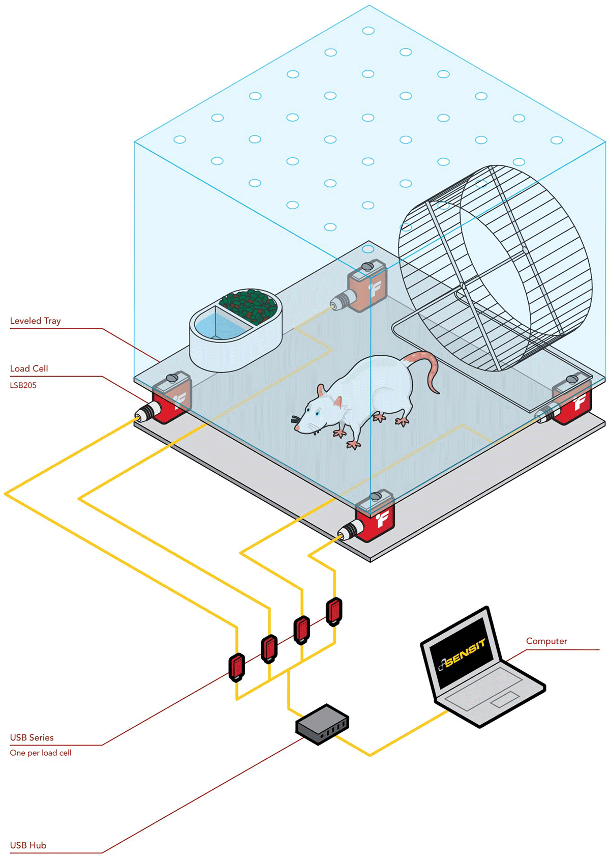 2、當白鼠在籠子里走動時,LSB200傳感器將測量的力信號輸出到各自的USB采集模塊上。