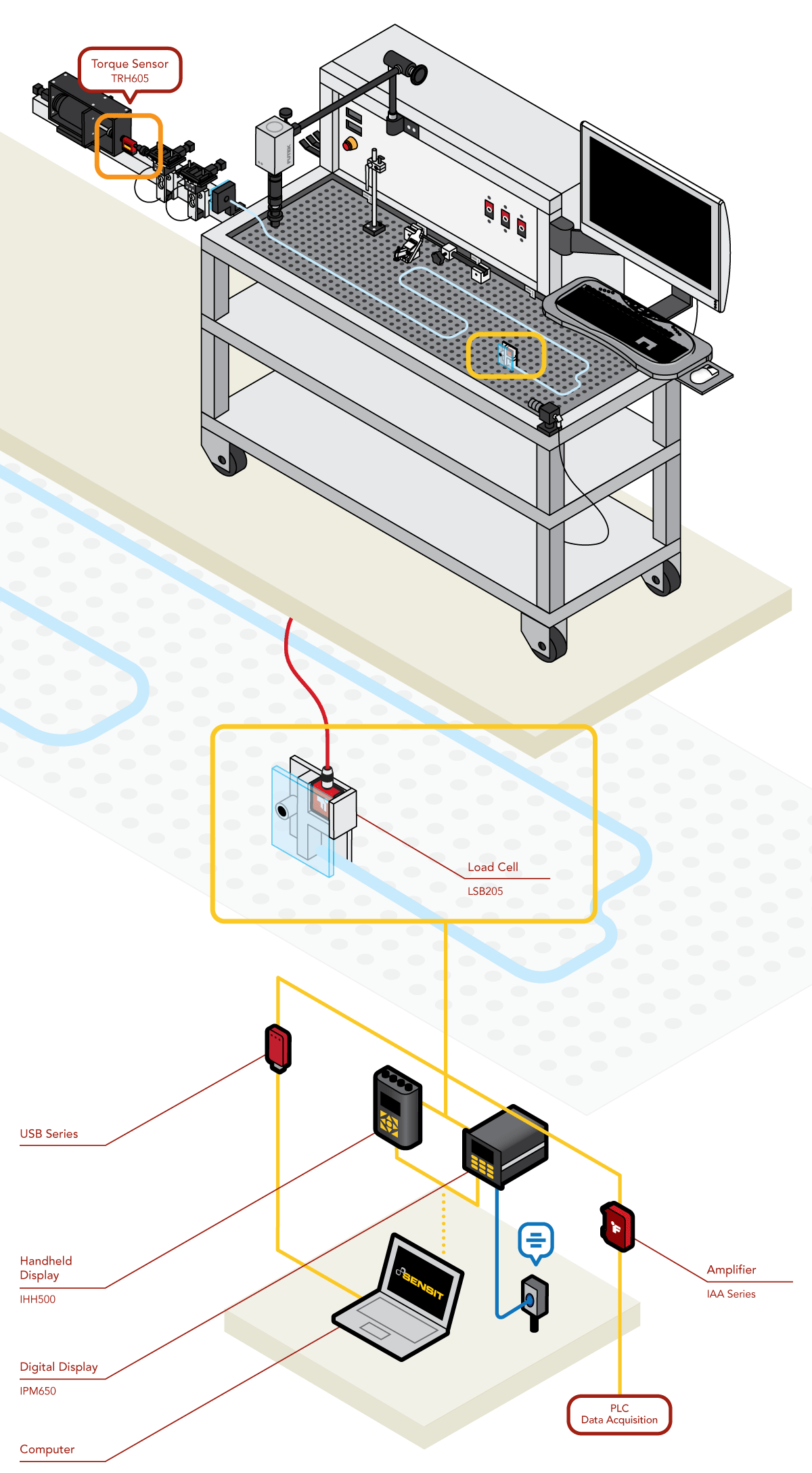 4、這些力的顯示可以通過計算機利用FUTEK 的 USB 采集模塊。FUTEK 的USB 采集模塊由 ASCII 和 DLL 配置,用戶可以根據需要集成定制軟件。