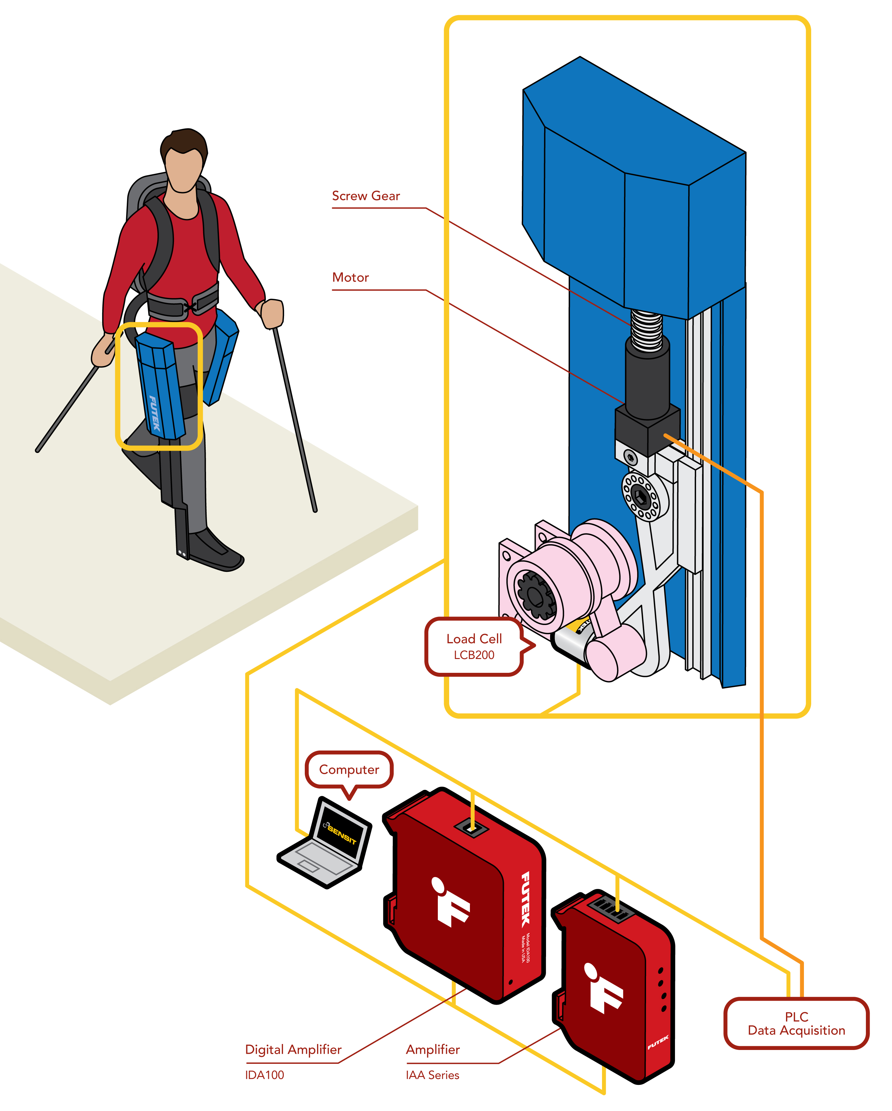 脊髓損傷(SCI)經(jīng)常讓病人幾乎無法再行走。2016年瑞士蘇黎世的神經(jīng)機(jī)械假肢運動會上,人類和機(jī)器認(rèn)知研究所(IHMC)的目標(biāo)是使用仿真外骨骼幫助解決這一問題。他們獨特的外骨骼太空服,名為Mina v2,使用的動力驅(qū)動機(jī)制將其綁在一個人的腿上,移動他們的臀部、膝蓋和踝關(guān)節(jié),讓一個人在不受幫助的情況下行走。FUTEK公司為他們的外骨骼提供了LCB200測力傳感器,它安裝在IHMC設(shè)計的特殊裝置中,使系統(tǒng)能夠從發(fā)動機(jī)得到準(zhǔn)確的力反饋,并關(guān)閉控制回路,所有這些都能讓傳感器安全地旋轉(zhuǎn)。